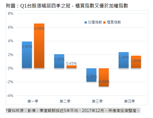 儘管台股近期較為跌宕,不少法人仍看好明年首季台股的表現,根據彭博統計過去 5 年季度報酬,第一季台股漲幅居四季之冠,櫃買指數又優於加權指數,保德信投信建議,投資人不妨布局中小型台股基金。