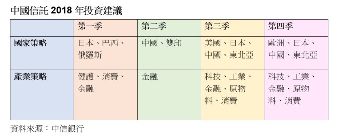 渡過有驚無險、股債雙漲的 2017 年,展望 2018 年投資能持盈保泰,中信金 (2891-TW) 旗下中國信託建議,可留意兩大趨勢、八大策略,資產配置新興市場優於成熟市場,產業首選人工智能變革受惠股。