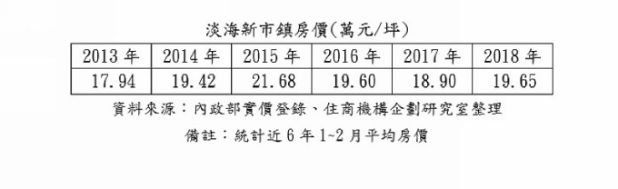 對於淡海新市鎮的房價走勢,住商機構依據內政部實價登錄統計 2013 年到今年 1-2 月的房價,最高點落在 2015 年,平均每坪 21.68 萬元,最低點在 2013 年,當年一坪僅 17.94 萬元,而近三年的低點是在 2017 年,今年又有小幅提升,平均每坪 19.65 萬元,平均單價雖有提升,但維持在 1 字頭。