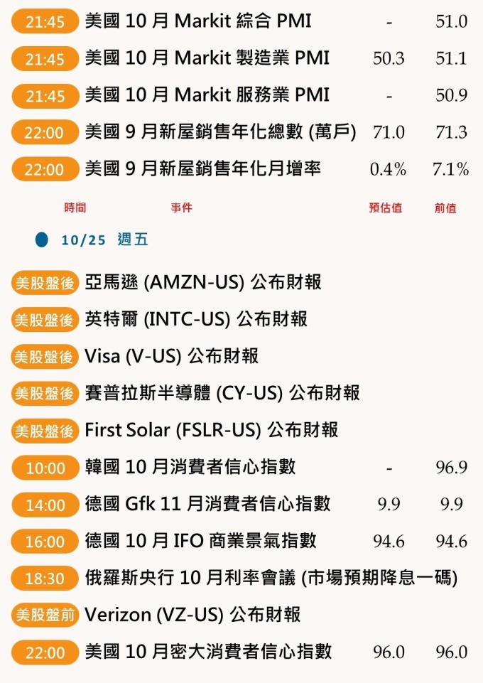 週四 (24 日) 美國將公布 10 月 Markit 製造業 PMI,此前 9 月美國 Markit 製造業 PMI 終值報 51.1,創下近 5 個月來新高,但是另一方面美國供應管理協會 (ISM) 公布之 9 月製造業 PMI 終值則報 47.8,是創下 2009 年 6 月來最低水準。