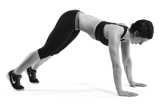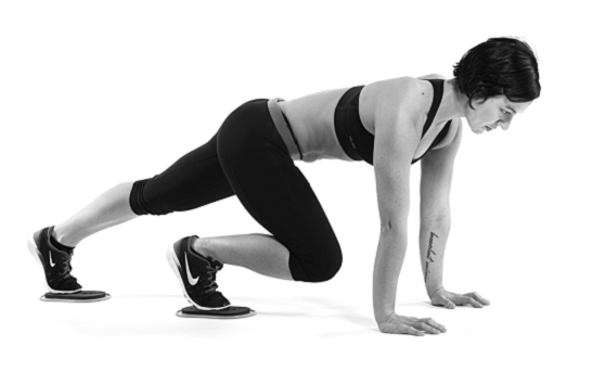 如何執行這個動作:先從伏地挺身的姿勢開始,雙腳的姆指球放在滑盤上。接下來就像跑步一樣,把其中一隻腳往胸部抬高,另一隻腳退回原位。盡可能重複最多的次數,稍作休息後再重複下一組。