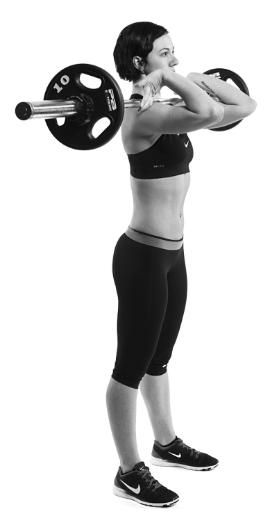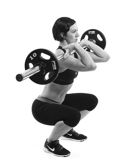 如何執行這個動作:雙手與肩同寬握住槓鈴。手臂圍繞著槓鈴,以手掌為中心點向上抬,直至手肘指向正前方為止,此時妳的上臂會跟地面平行,槓鈴也會落在肩膀的上方。接著身體站直,將槓鈴舉起離開槓鈴架,並且後退一步。雙腳與肩同寬,腳趾指向前方或稍微往外展。屁股往下蹲,直至大腿與地面平行為止。然後再站起來回到起始姿勢,繼續重複動作。