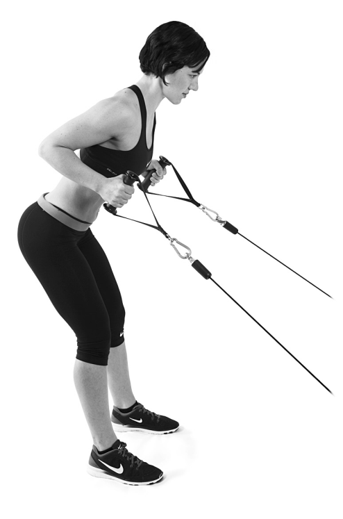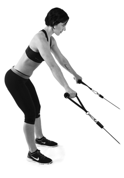 如何執行這個動作:如同其他划船動作一樣,只是現在雙手都握著把手,同時手臂在身體的前方伸直。接著將把手同時拉到胸部旁邊,再回到起始姿勢,然後重複動作。