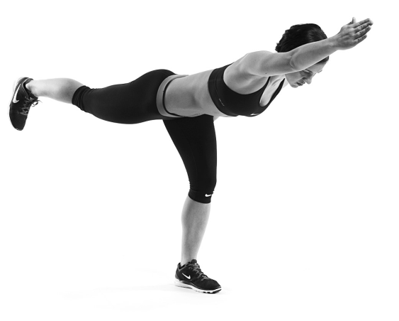 如何執行這個動作:雙腳與臀部同寬站好,身體往前傾,同時右腳往身體的後方打直延伸,右手往前伸直,左腳負責支撐所有的體重。當妳的右手跟右腳與身體軀幹連成一直線,同時左腳伸直並與地板垂直時,即為動作的結束姿勢。接著左邊臀部用力讓身體回到起始姿勢。完成所有重複次數後再換邊進行,讓左手與左腳往身體的前後方延伸,此時則由右腳支撐所有的體重。