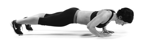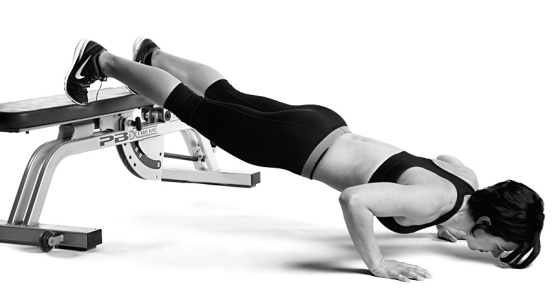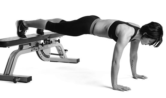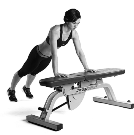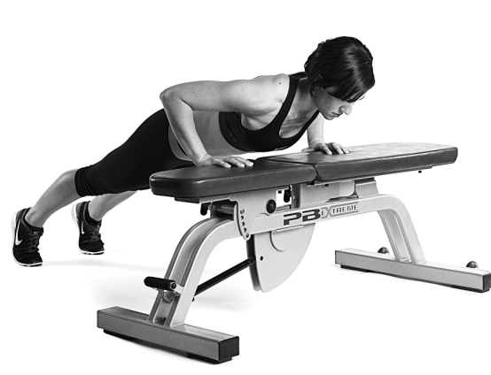 沒辨法維持良好的姿勢?可以改用雙手放在箱子或臥推椅的方式進行伏地挺身。如果使用60公分高的箱子,即等同於舉起自身40%的體重。如果是30公分高的箱子,則是舉起一半體重還要再多一點的重量。所以開始時盡量抬高身體來完成課表設定的重複次數,就算妳需要身體前傾靠在牆壁上進行也無所謂。隨著身體適應後再逐漸讓抬起的高度變低,直到能夠在地板上完成標準的伏地挺身為止。