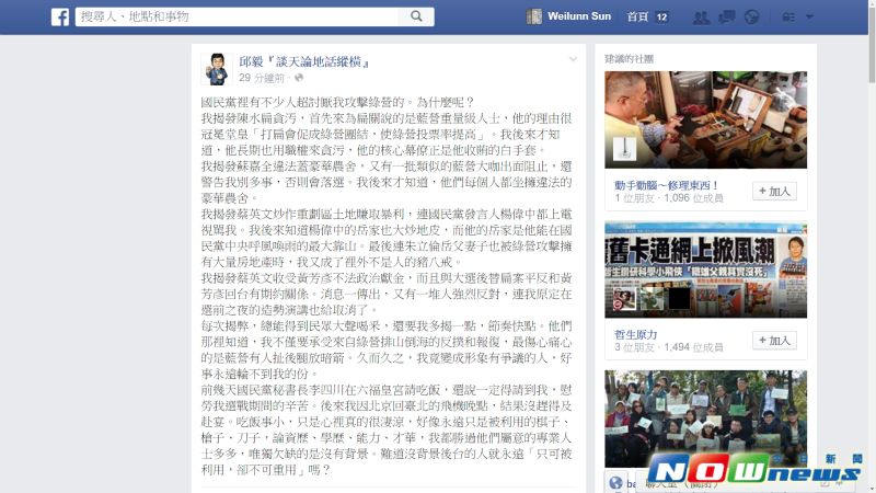 前國民黨立委邱毅日前在臉書上感嘆說,自己不斷揭弊,受到對手陣營反撲報復,自己陣營也有人扯後腿放暗箭,久而久之讓他變成形象有爭議的人。他有感而發地說,自己資歷、學歷、能力、才華都勝過他人很多,唯獨沒有背景讓他「只可被利用,卻不可重用」,覺得「心裡很淒涼」。對此,民進黨立委姚文智今(25)日說,這是邱毅「咎由自取」,大家都看在眼裡,沒什麼好評論的。