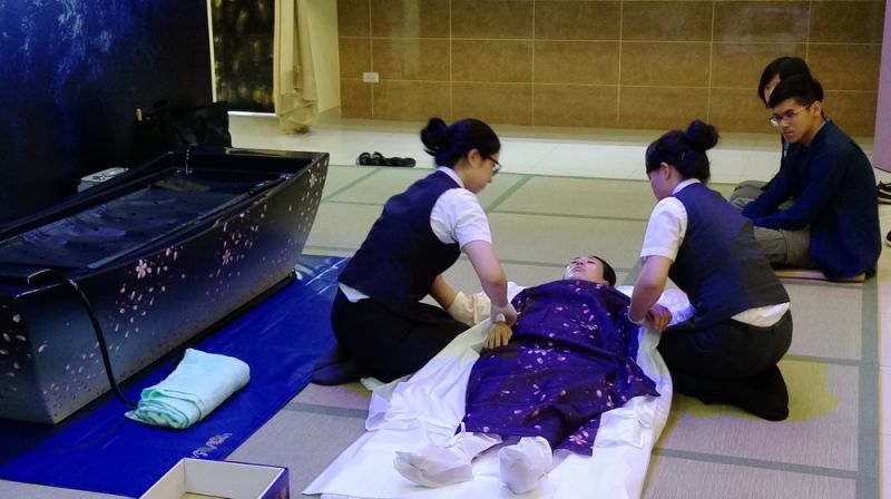 自費到日本學習湯灌技術的黃于珍原是護理師,目前是自然圓公司的執行長,由於在病房見到許多生老病死,對死亡既不陌生也不害怕。為了改變國人對傳統殯儀的恐懼,與南華大學生死學系助理教授洪筱蘋、好友梁雅婷及李佳柔4人,共赴日本學湯灌技術3個月,習得大和民族對亡者的尊重,及悲傷輔導,迅速幫助喪家從失去親人的傷痛中走出。 黃于珍說,這次自然圓與日本最大湯灌公司(CSC)、develo三家公司合作示範,由CSC執行長山中宏一講解湯灌技術,由四名全台首批領取CSC證照的女湯灌師示範,由女性扮演亡者,讓女湯灌師做遺體SPA,供現場學生及殯葬業者學習,如何幫亡者做湯灌,引導家屬參與湯灌儀式。