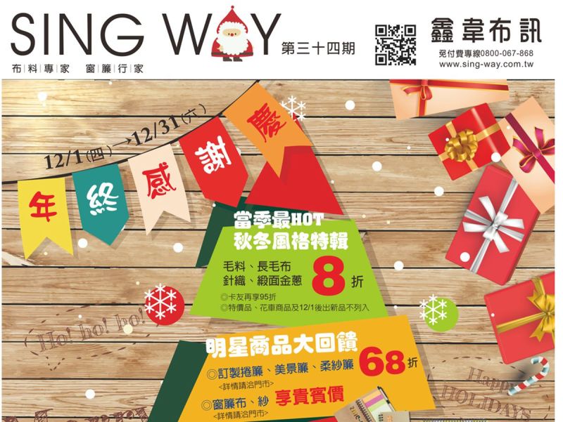 年底最大檔,就是要讓您佔便宜,快來感受鑫韋布莊的誠意,全館精選商品,讓您天天享優惠!相關活動請洽鑫韋布莊官網www.sing-way.com.tw,或上粉絲團觀看相關訊息。