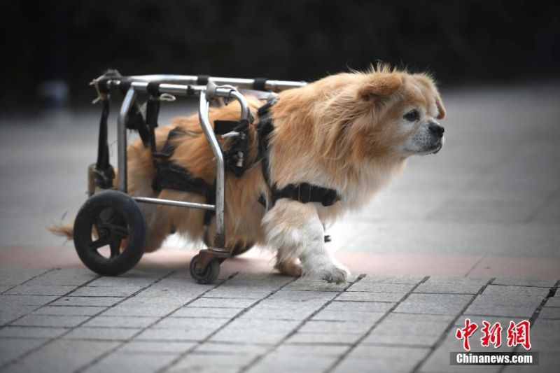 重慶街頭12月6日一半身殘廢的小狗依靠輪椅行走。
