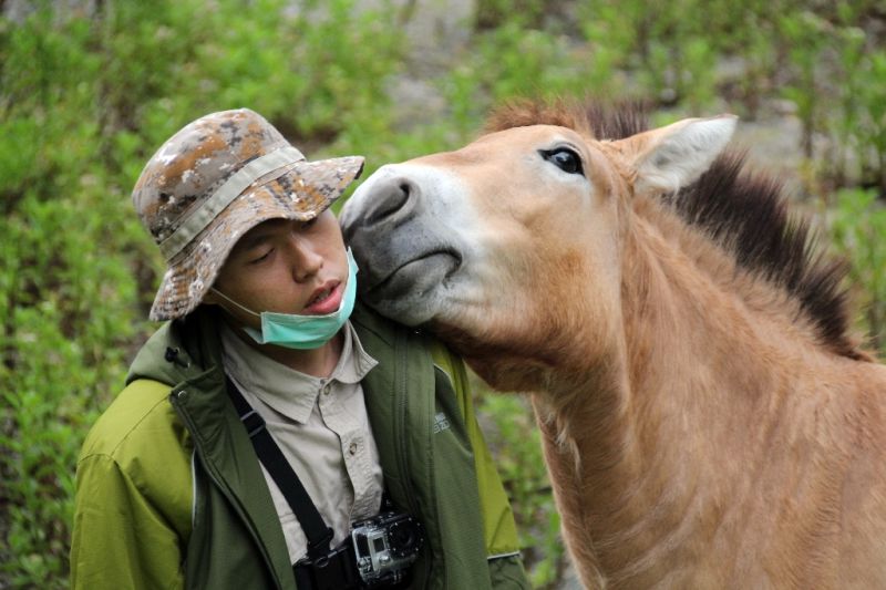 目前三歲的母蒙古野馬「勇春」,透過近半年的親近訓練,已經和保育員培養出良好的默契,當「勇春」看見保育員拿起專門梳理毛髮的綠色毛刷,便會開心地隨保育員的指令來到特定地點,溫馴地讓保育員運用毛梳在身上進行梳理。雖然「勇春」原本就比較親近人,但還是得透過保育員從在內舍隔著柵欄呼喚撫摸開始、逐漸熟悉毛刷,並隨時間一點一滴累積出信任感,才讓「勇春」完全卸下心防。