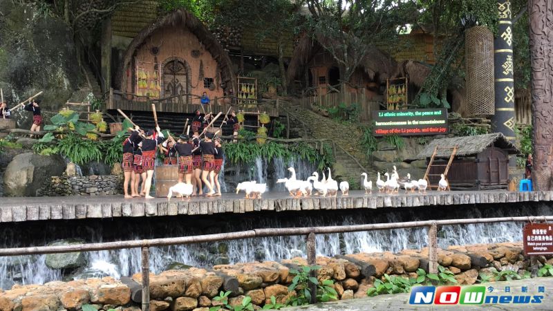 接著以黎族知名的黎錦、山歌等主題,表現黎族風情。最有趣的是,表演者還趕了2隻水牛、一群白鵝,以及幾隻山羊到舞台上參加演出,讓觀眾掌聲連連,最後則是以氣勢滂礡的竹竿舞作結束。