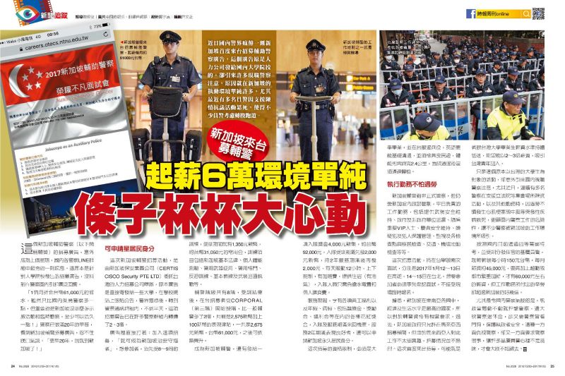 近日國內警界瘋傳一則新加坡首度來台招募輔助警察廣告,這個廣告原是人力公司發給國內大學院校的,卻引來許多現職警察注意,原因就在新加坡的執勤環境單純許多,尤其最近有多名員警因支援陳情抗議活動累死,使得不少員警考慮轉換跑道。