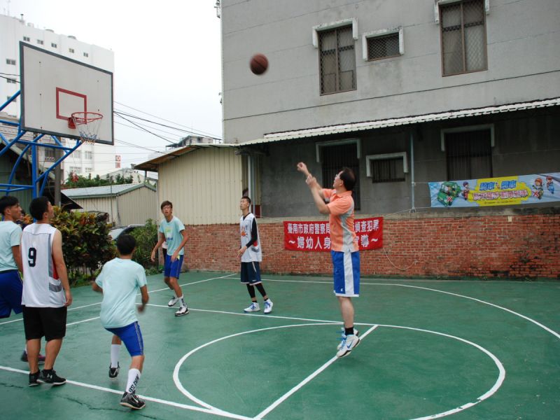 為提供員警運動環境,台南市警局佳里分局清理分局後方閒置空地,闢建為半場的籃球場及小公園。31日,分局員警與社區學校學生舉行3對3鬥牛賽。佳里分局長莊勝雄表示,運動健身可保健康,希望同仁注意健康,才能提供民眾更優質的服務。