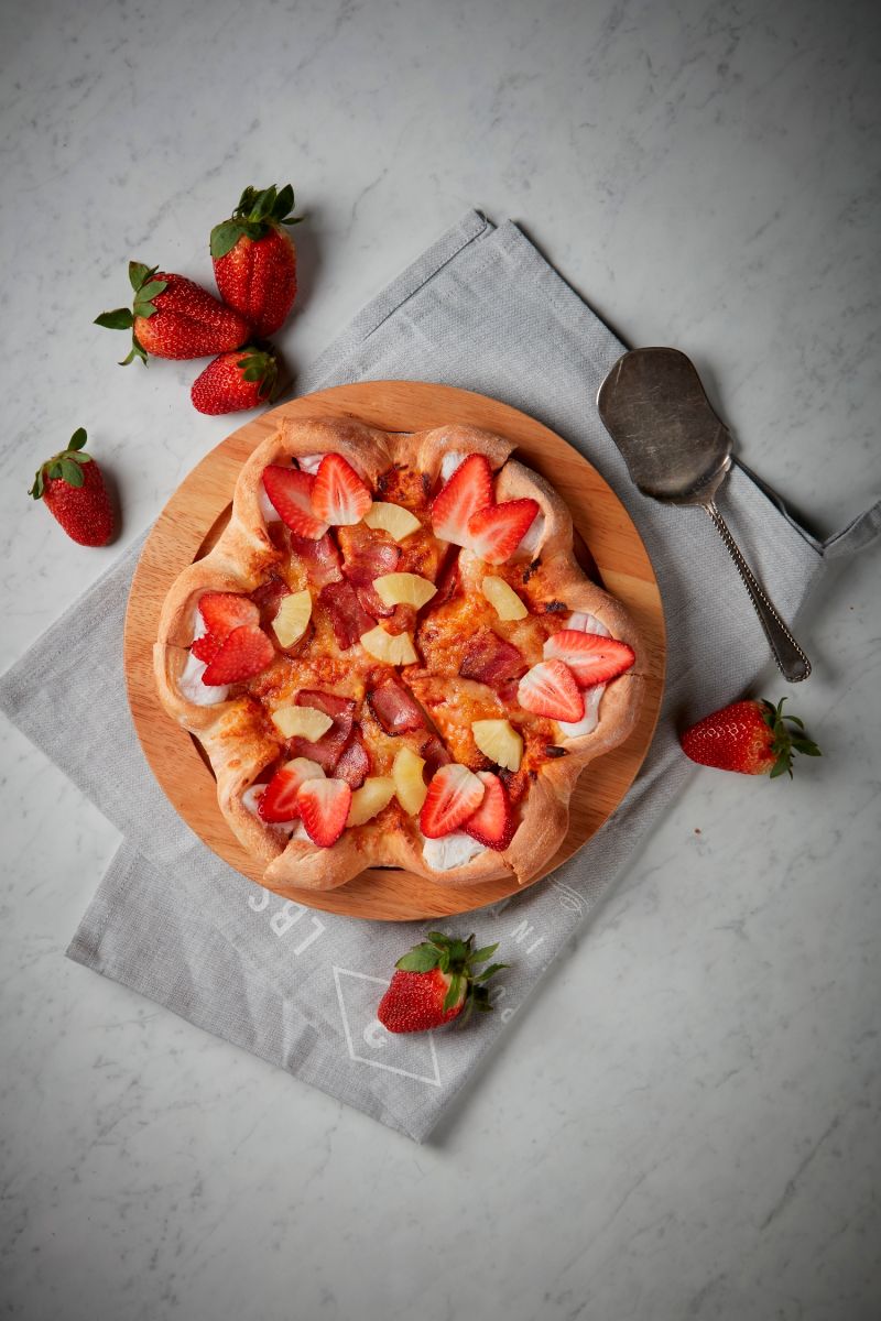 美式餐廳連鎖店「瓦薩美式比薩」大玩創意,首創「草莓大福捲心」比薩,將滿滿的日式草莓麻糬包入香Q的比薩外圈餅皮內餡中,一口咬下大福內餡隨即爆漿牽絲,散發濃濃草莓香甜,比薩邊更擺上整圈的當季苗栗新鮮草莓片,只要加一個銅板價50元,即可任選加入瓦薩12款不同口味比薩。