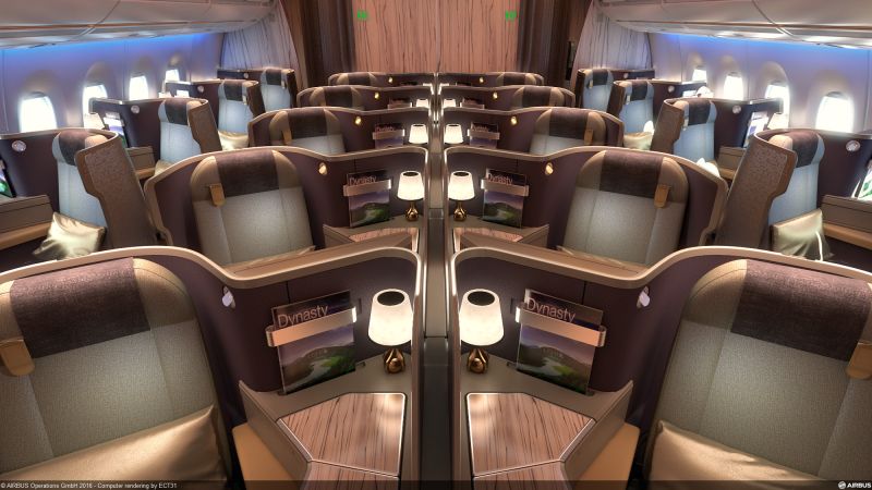 中華航空 2016 年領先國內業界引進最新型空中巴士 A350-900XWB 新世代中長程客機,以「最科技、最環保、最節能、最寬敞、最安靜」著稱。新機跳脫以往暗色為主的傳統客艙設計,以金屬光感的異材質拼接為客艙增添時尚現代感。客艙挑高遼闊視野,打造獨立私人空間,配備符合人體工學的智慧座椅,輕易就可進入深層睡眠,提供量身訂做的舒適飛行。