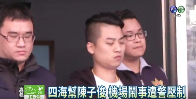 「四海幫海巨堂」堂主陳子俊被檢警發現,在香港立法會議員羅冠聰等人到達桃園機場時,也混在抗議人士當中,懷疑他率眾堵人。28歲的陳子俊前科累累,曾是犯下殺警案的中山聯盟其中一個小弟,之後跳槽到四海幫,竟一路升到堂主,常常帶著幾十名小弟到處鬧事,被逮後交保又繼續胡作非為。