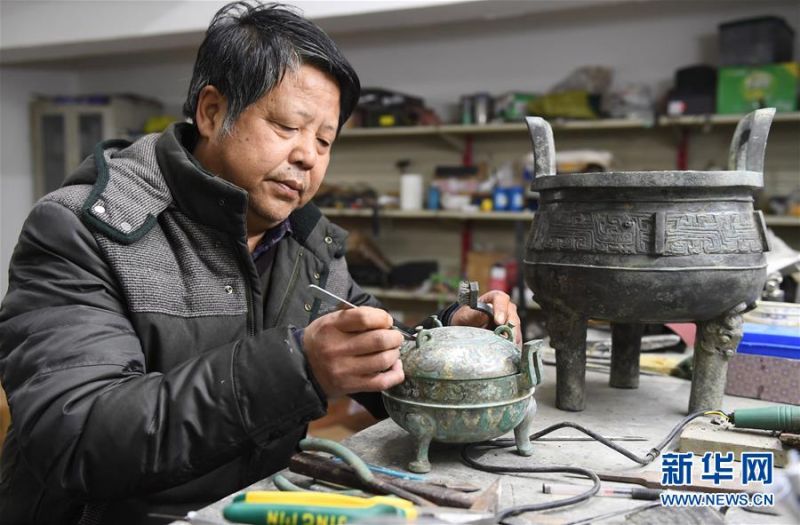 1月11日,在湖北省宜城市博物館,修複專家易澤林對漢代錯金青銅鼎進行修複。
