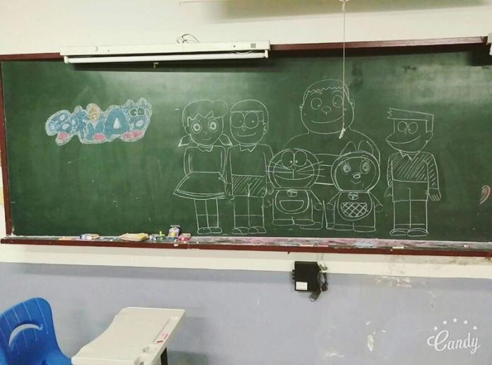 該名餐飲管理系的網友表示,他有一位同學很會畫畫,因此很常在畫本裡創作,曾經畫過「米奇」、「101忠狗」、「龍貓」、「維尼」等,近日更是在黑板上畫了「哆啦A夢」系列的人物,除了哆啦A夢和大雄,還畫了大雄的同學們。