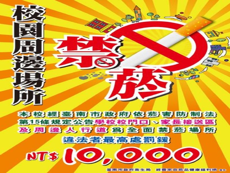 為保護青少年學子免於二手菸害,台南市衛生局宣佈全市315所高級中等學校以下學校,即日起共同推動校園周邊環境全面禁菸,學校校門口、家長接送區及人行道等戶外場所納入禁菸場所規範。呼籲民眾共同遵守,如違反規定,將依法處予新台幣2000元至10000元罰鍰。