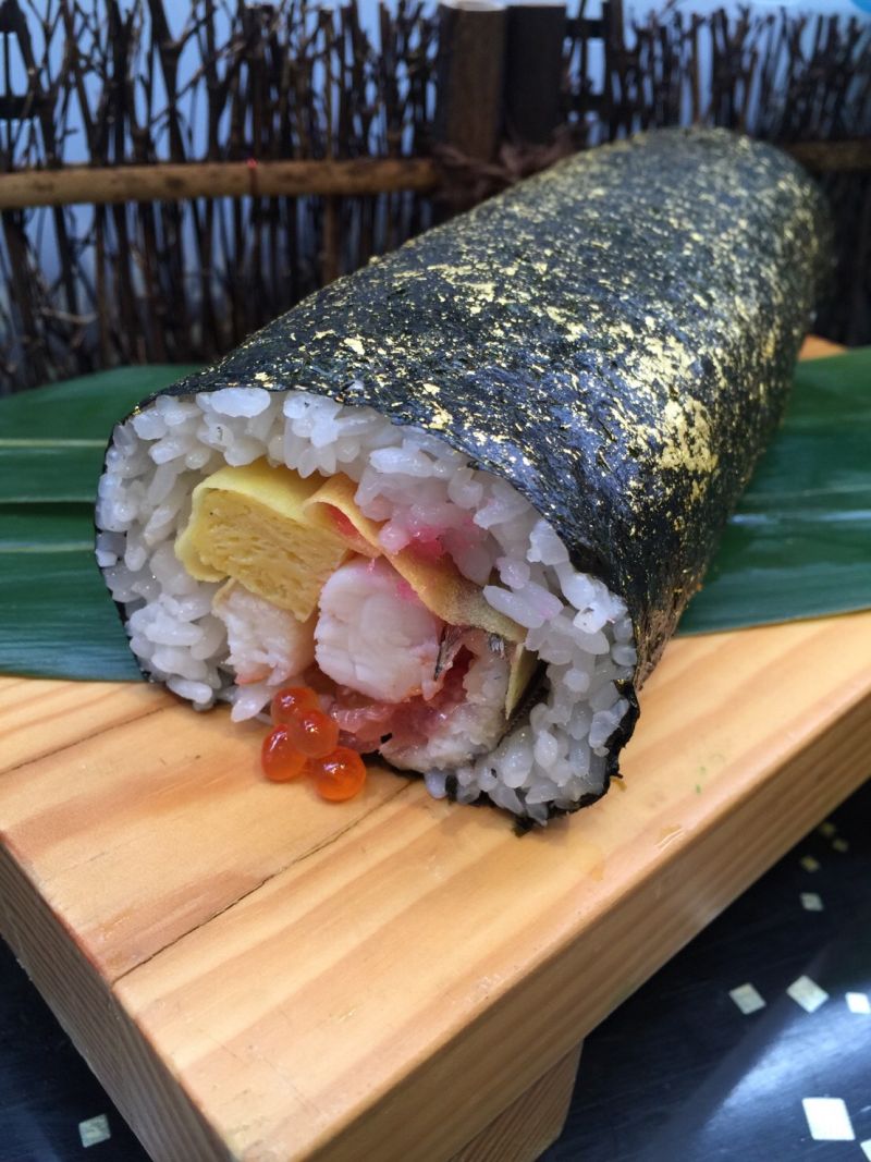 「惠方卷」是指在日本立春前一天節分這天食用便能帶來好運的粗捲壽司,完整沒有切的惠方卷,將七種福氣食材捲入,象徵著七福神的好運,今年微風超市特別升級要在金雞年給消費者不一樣的惠方卷,「特上惠方卷」以黑鮪大脂、穴子及松葉蟹腳、大蝦及鮭魚卵、玉子燒外層並加上食用金箔,十足開運金。