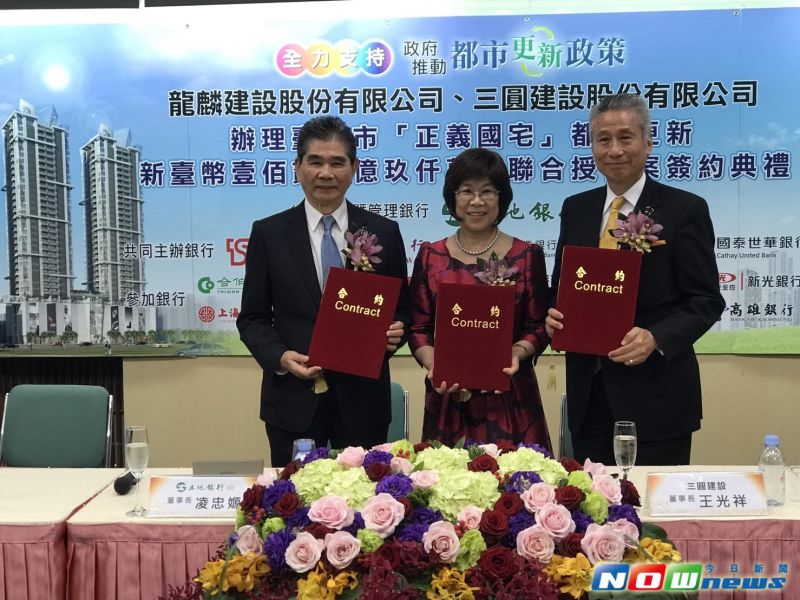 正義國宅都更聯貸案簽約,由土地銀行董事長凌忠嫄與龍麟建設董事長葉松年、三圓建設董事長王光祥代表銀行團及建商完成簽約,包括財政部次長蘇建榮、內政部次長花敬群、台北市都市更新處長方定安出席與會,3人也在致詞中強調,都更實施過程中必須結合政府、民間與銀行三方的資源,透過加速推動老舊住宅重建,改善國人居住環境,更可創造國內相關產業的產值,進而活絡內需市場。