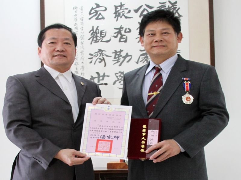 軍中退役後,王文成被國防部後指部遴選接受國家安全訓練,因表現優異,去年底獲頒國防部頒發銀二星榮譽獎章。許光華校長表示,王文成校友在事業有成後,仍積極上進,這是莘莘學子們的好榜樣。此次,榮獲銀二星榮譽獎章,更是對他熱心公益,全力付出的肯定。