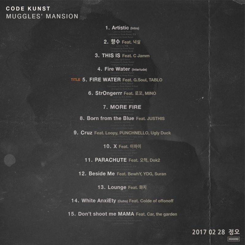CODE KUNST將於28日公開的新專輯《MUGGLES’ MANSION》,一共收錄15首歌曲,而歌手WINNER宋旻浩、LEE HI李遐怡、LOCO、吳赫、Dok2、BewhY等人都有參與歌曲演唱,主打曲的Feat則是由Tablo和G.SOUL助陣,超級強大的配唱陣容,令各界相當期待CODE KUNST新專輯的公開。