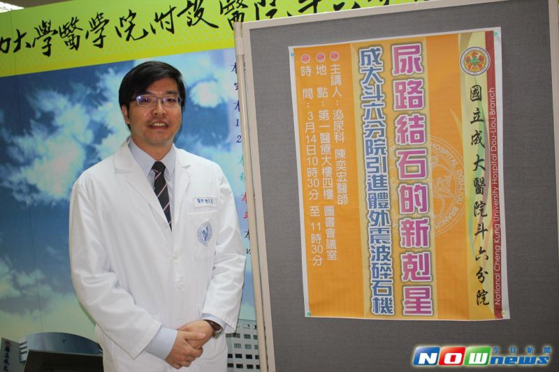 成大醫院斗六分院14日上午泌尿外科主任陳奕宏醫師在尿路結石成大斗六分院引進新剋星「體外震波碎石機」,陳奕宏醫師表示,一位72歲女性多年來一直有腎臟結石的問題,過去曾接受體外震波碎石治療,但效果不彰,且碎石過程中的疼痛讓她聞「體外震波碎石」色變。無奈結石日漸增大,加上頻繁的腰痛、血尿和發炎,讓她不得不再次接受體外震波碎石治療,所幸在成大斗六分院的治療順利,不僅結石明顯粉碎,疼痛程度也不若以往,令病患又驚又喜。