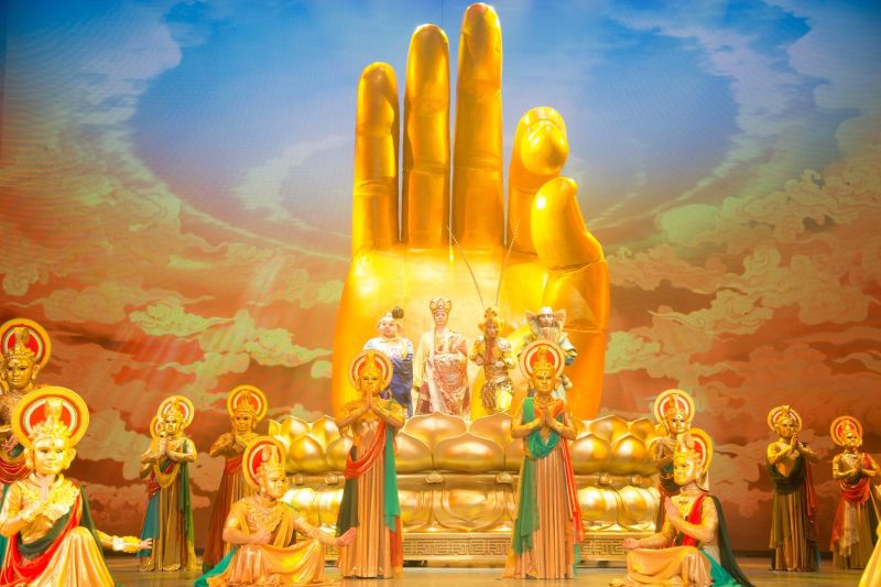 其中一個壯觀場景是有八個佛教的守護神圍著15公尺、重達7噸的巨型佛手,唱著改編自《西遊記》最終章的聖歌《佛頌》,帶出極光和彩虹,把邪惡的反派打成灰燼,表達改邪歸正,化恨成愛的中心主題。這也是中國秀《西遊記》中最主要以及最經典的一幕。