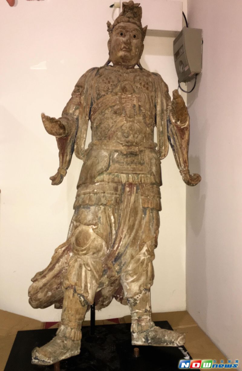 為了瞭解佛像來歷,游先生委請相關單位鑑定,確認這尊木雕彩繪天王立像係屬中國遼金時期古物,約有千年歷史,具有高度文物價值;天王像身披鎧甲,高164公分、寬68公分、厚度50公分,昂藏威武氣勢不凡,雙目依然炯炯有神,雕工精緻細膩,整體保存完整並無殘缺,實屬難得。