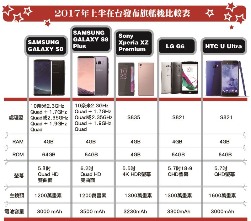 三星S8與S8+與 Sony Xperia XZ Premium,外型不約而同都採用鏡面,但三星陣營共有黑、紫灰、銀、金、藍,Sony只有黑色與銀色,但由於都未發表在台灣上市規格,實際狀況必須等待台灣發布會,才能得知實際情況。