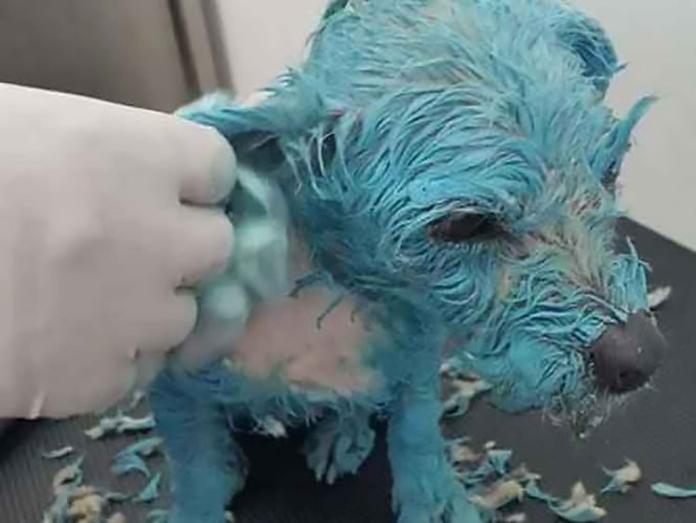 據英國《都市報》報導,這隻狗狗名叫Muneca,在一處倉庫被人發現,牠不僅全身被染成藍色,還被強灌油漆及溶劑,甚至還被冰斧刺傷,雖然被緊急送往動物醫院接受治療,最後仍不幸身亡。
