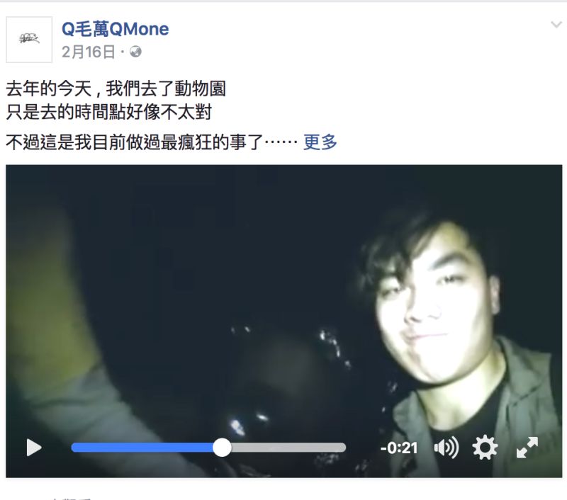 由文化大學陳姓學生所創辦的「Q毛萬QMone」粉絲專頁,其不時會在臉書上分享自己創作歌曲;但今年2月其在粉專上上傳一段影片與2名友人夜闖台北市立動物園,甚至拿手電筒照射動物的影片,園方今日上午已到警察局報案,但「Q毛萬QMone」似乎不覺得有悔意,甚至還在臉書上發文「如果你們覺得這個違法,那把動物關在籠子裡是合法?」