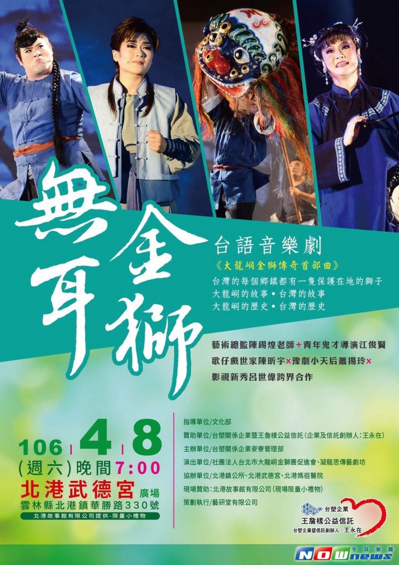 台塑關係企業暨王詹樣公益信託首次邀請大龍峒無耳金獅團下鄉戶外巡演,8日晚間7點在北港武德宮演出劇碼「大龍峒獅傳奇首部曲-無耳金獅」台語音樂劇,音樂設計以歌仔戲曲調(如思想起、雜唸調等)改編,用樸實的民間傳說與代代傳承的舞獅技藝,並結合兄弟情義,自成一方格局。