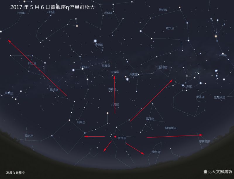 北市天文科教館說,寶瓶座流星雨出現於每年4月19日至5月28日,它的主要來源為哈雷彗星殘餘的塵埃,特色為速度快而明亮,最適合於極大期的5月6日前後幾天觀賞,呼籲對星象有興趣的民眾可把握機會前往欣賞。