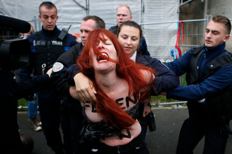法國總統大選第一輪投票時,女性主義運動團體「費曼」(FEMEN)曾以裸胸方式抗議,7日該團體又在埃南博蒙拉布條,向雷朋抗議。