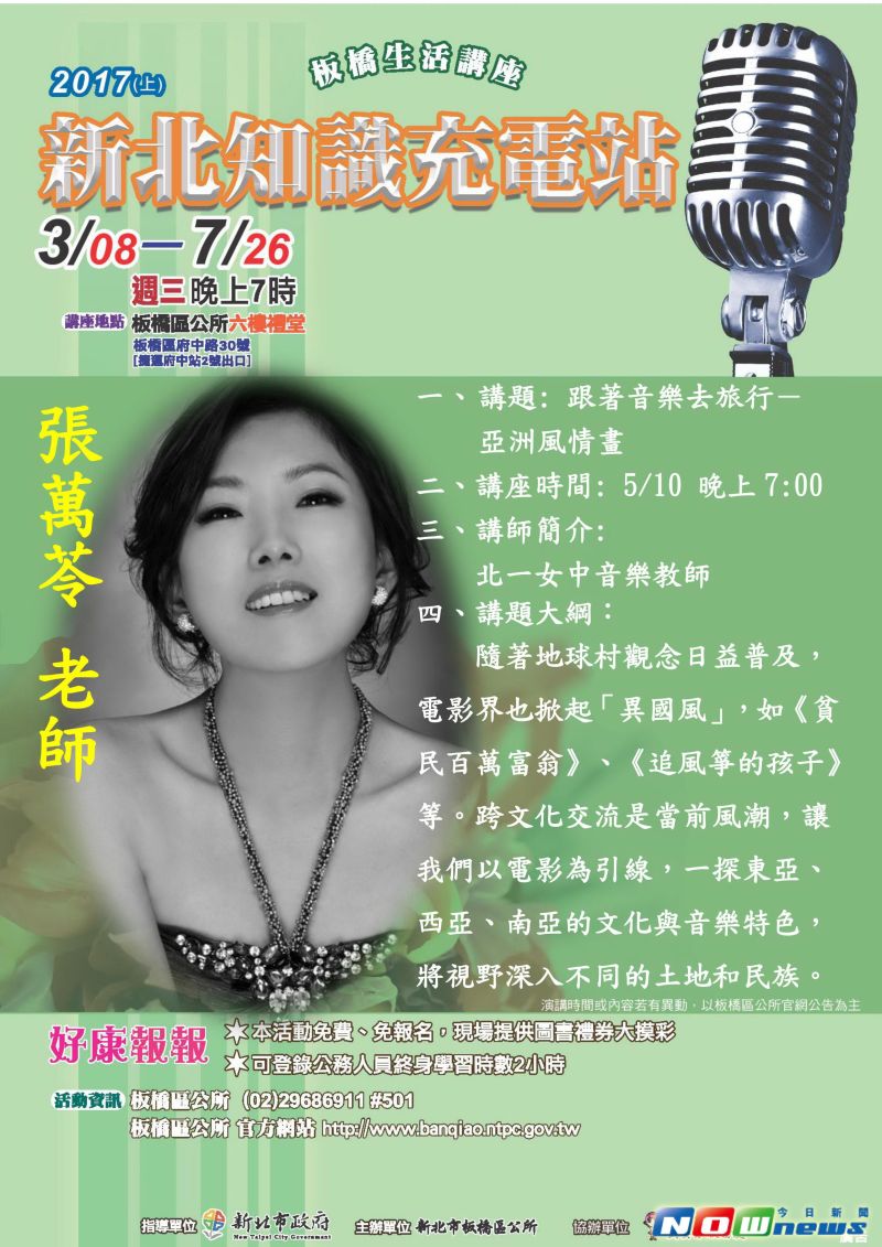 板橋區公所表示,「2017(上)板橋生活講座」將於5月10日的晚上7點,邀請北一女中音樂教師張萬苓在板橋區公所的6樓禮堂,演講「跟著音樂去旅行-亞洲風情畫」;本講座免費入場,現場並有抽獎活動,詳情請至板橋區公所全球資訊網(http://www.banqiao.ntpc.gov.tw)查詢,或電(02)29686911轉501洽詢。