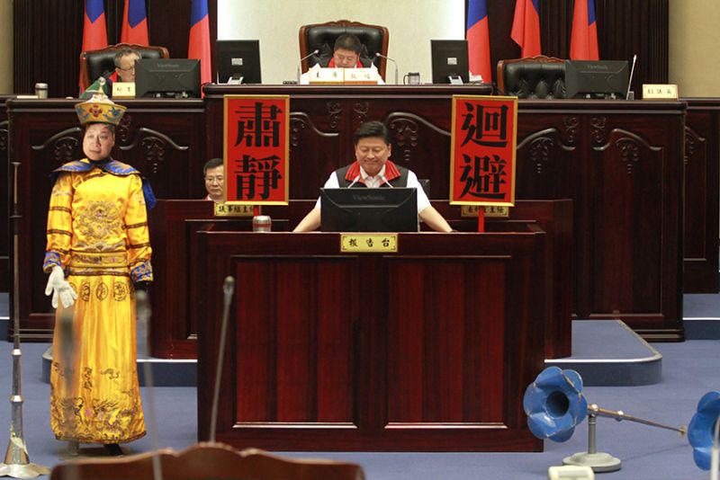 花蓮縣議會定期會總質詢今天展開,議長賴進坤排定首位質詢,一開始,就在備詢台旁放上一個名穿著龍袍、貼有傅崐萁頭像的人型模特兒,播放古裝劇皇帝影片,接著由縣議員莊枝財宣讀「聖旨」。
