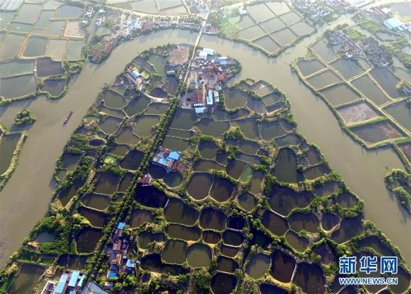 浙江省湖州市南潯區荻港村的一片桑基魚塘被一條運河支流包圍,呈現出半島狀。