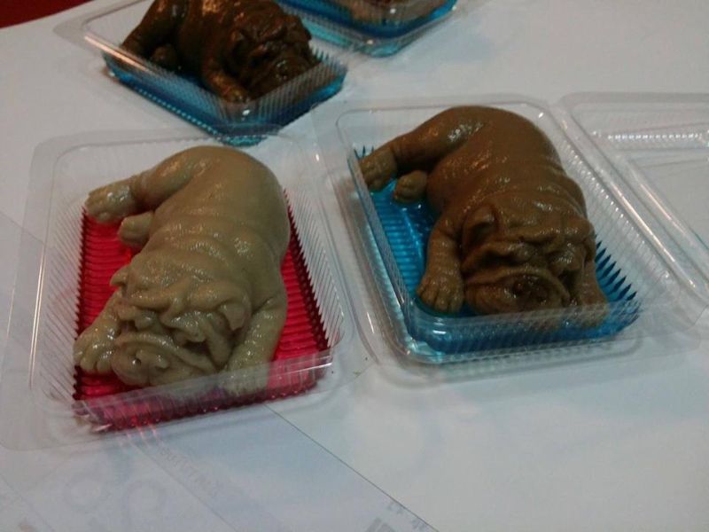 照片中可見,不同顏色的沙皮狗小寶寶,紛紛趴睡在透明的塑膠盒子內,無論是紋路和皺摺,作工皆栩栩如生,但其實這些都只是椰子果凍。這些逼真的沙皮狗果凍在網路上被網友們瘋傳,不過也令網友們大呼:「真的太像真的沙皮狗了,不敢吃!」