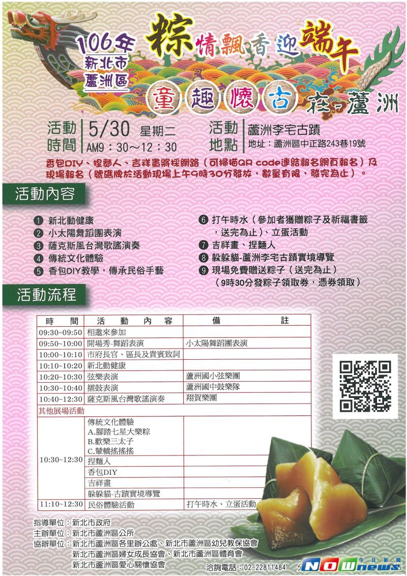 蘆洲區長賴俊達表示,為延續傳統的民俗文化,區公所近幾年與財團法人蘆洲李宅古蹟維護文教基金會合作,在蘆洲李宅古蹟辦理端午的活動,今年則規劃民俗體驗、舞蹈、樂器表演及免費品嚐粽子的系列活動;此外,蘆洲李宅當天也安排志工免費為民眾實境導覽古蹟,讓大家徜徉在古色古香的環境,享受人文、歷史、彩繪之美。