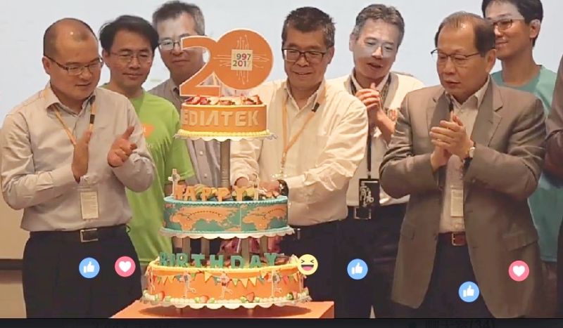 聯發科今日以「 Connecting the next billion 」聯結無限、創意長發為主題,歡慶 20 歲生日,並在臉書官網開放直播,與全世界員工一起慶祝。一開始播放 20 周年紀念影片,影片中,董事長蔡明介以書法寫出「創意」二字,希望公司創新創意持續與生活領域連結,創造美好未來。台積電董事長張忠謀、日月光營運長吳田玉也都透過影片獻上祝福。