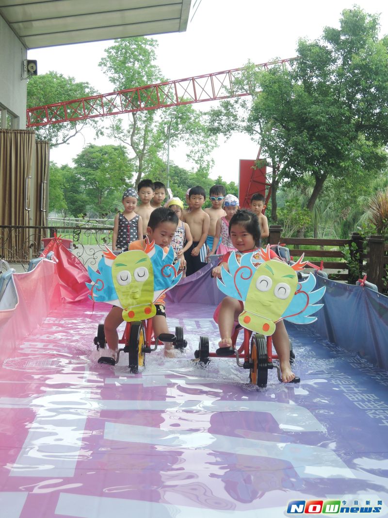明道大學附設幼兒園園長許鎰萍說,本來划龍舟只能在水面上,但顧及小朋友的安全,老師才想出架個簡便游泳池的方法,用三輪車當龍舟,小朋友騎著龍頭比賽看誰最快,水上騎比在路上騎好玩,讓他們還是可以比賽龍舟跑得快,比賽完後,這些可愛的小朋友各個變成水中蛟龍,一起玩水消暑。