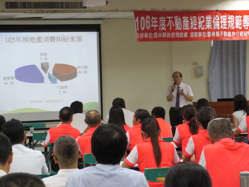 縣府地政處上月25日與雲林縣不動產仲介經紀商業同業公會共同辦理講習暨座談會,參加人員包括鄰近縣市政府地政人員及雲林縣不動產經紀商業同業公會人員約130餘人。本次講習邀請內政部地政司陳科長啟明蒞臨授課,課程內容包含不動產經紀業執業規範與須知、實務案例闡述及不動產說明書常見錯誤態樣分析等。