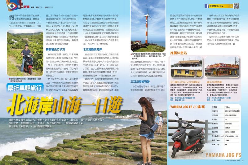假日時,不想錯過市郊的美景,又不願塞在車陣中,騎機車,可說是短程旅行很好的選擇。以大台北地區來說,想要輕鬆地一日看盡山海,陽金公路+淡金公路是一條很推薦的路線,從台北市區出發,一路經陽明山、金山、石門、三芝、淡水,全程約80公里,騎著115cc的YAMAHA JOG FS 可說輕鬆寫意。這段路程光是旅遊書上介紹的景點就超過100個,但請記住,機車輕旅行的最大樂趣在於「隨興」,看到好奇的指標,歡迎隨時轉彎。