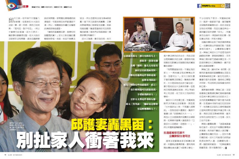「有問題直接找我,不要扯我的家人。一再地拿沒有的事情出來說,怎麼可以?」邱太三對於妻子當初離開法官職位,難掩些許歉疚,太太是因為他從政才辭法官。妻子是他的台大法律系同學,但是用功程度遠勝邱部長,所以早3年考上司法官,成了邱太三司訓所的學姊。