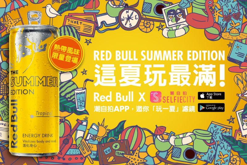 2016年末,Red Bull限量引進Red Edition並於東區打造期間限定店 R.E.D,引發一陣紅色炫風。今年夏天,就是要讓每一刻都是你的精彩時刻!Red Bull 不只隨時給你能量補給,Red Bull Summer Edition更要提供給你不同的熱帶風味,用清爽口感當你最High的夏日玩伴,在所有需要能量的時刻,給所有夏日嗨咖一對翅膀!同時,為了不錯過所有精彩鏡頭,Red Bull與當紅自拍App – SelfieCity 潮自拍合作推出期間限定「玩一夏」濾鏡,讓所有夏日回憶能被完美捕捉,讓你的夏天不只要玩好玩滿,還更要潮流入鏡!即日起至7/4止, 手機下載SelfieCity潮自拍APP,使用「玩一夏」濾鏡拍下你的夏日風格照,上傳至Instagram 並標記Hashtag #玩一夏,Red Bull將選出最嗨玩咖送出Red Bull Summer Edition以及美圖手機M6等玩夏驚喜!欲瞭解更多活動詳情,請上活動官網:
