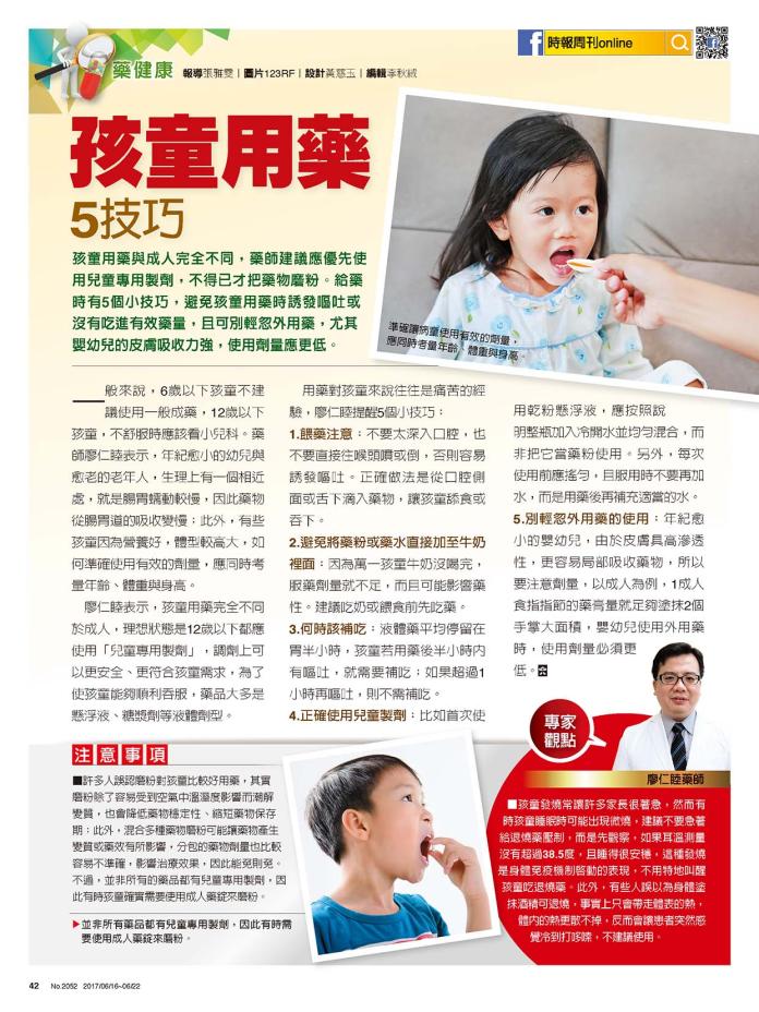 孩童用藥與成人完全不同,藥師建議應優先使用兒童專用製劑,不得已才把藥物磨粉。給藥時有 5 個小技巧,避免孩童用藥時誘發嘔吐或沒有吃進有效藥量,且可別輕忽外用藥,尤其嬰幼兒的皮膚吸收力強,使用劑量應更低。
