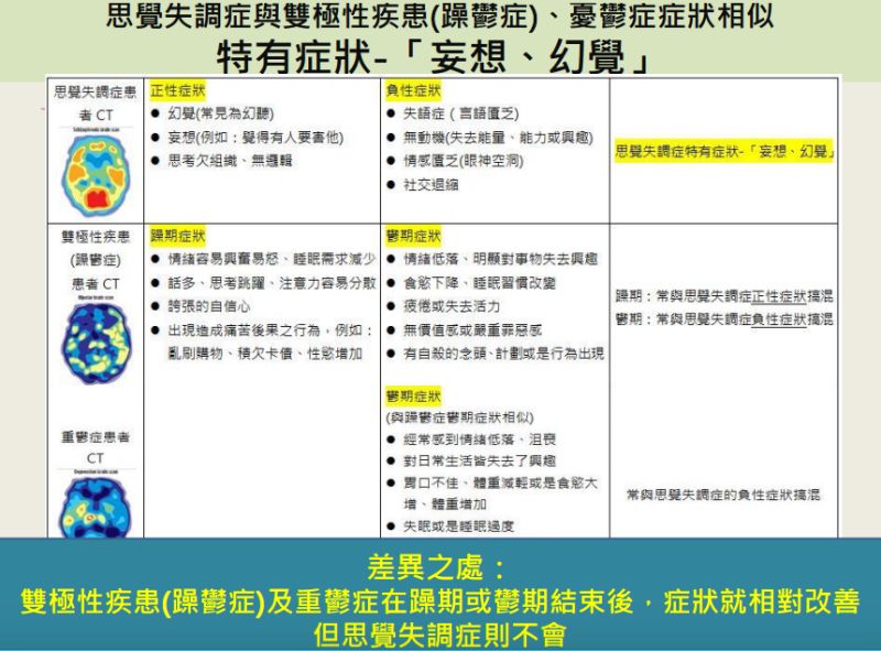 朱柏全強調,思覺失調症與躁鬱症、重鬱症的最大差異,在於患者是否出現幻聽、幻覺的症狀,且躁鬱症及重鬱症在躁期或鬱期結束後,症狀就相對改善,但思覺失調症則不會,目前思覺失調症藥物發展已相當成熟進步,每天規律服用口服藥或施打長效針劑,能夠有效控制症狀。