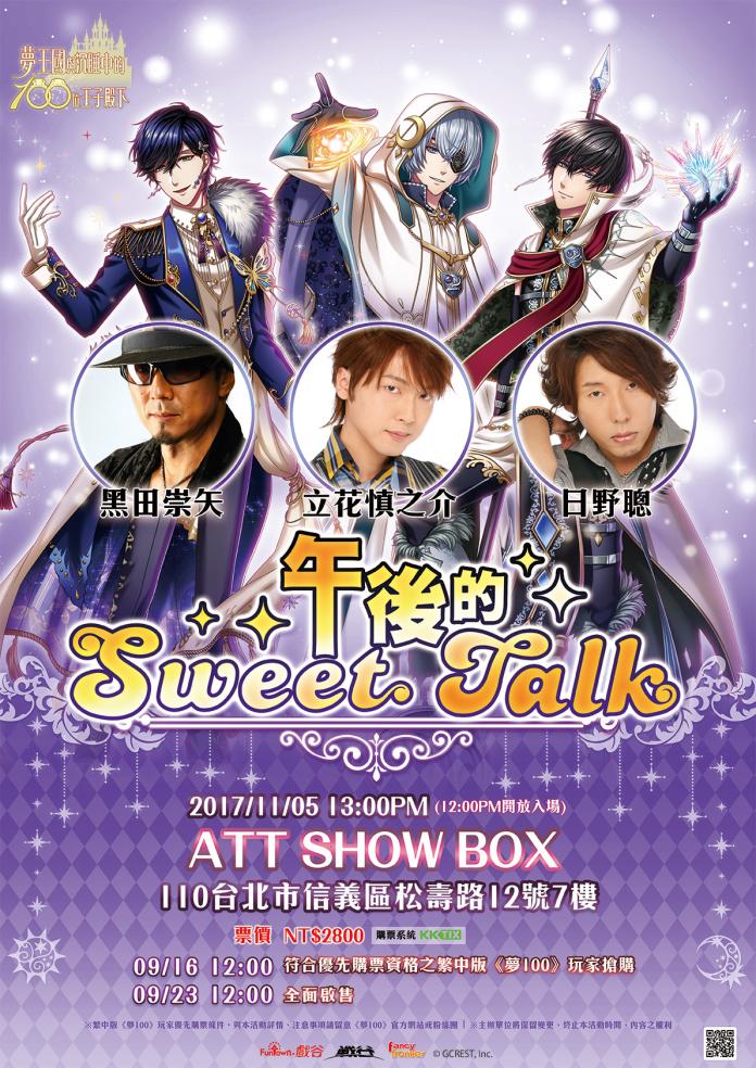 今年營運團隊專程邀請到配音王子的聲優:黑田崇矢、日野聰、立花慎之介三位蒞臨台灣,將於11/5(日)在ATT SHOW BOX帶給玩家一場午後充滿甜言蜜語的約會。值得一提的是,立花慎之介的首次海外演出就獻給《夢100》了,相信聲優迷的玩家們必定迫不及待想參加這場盛宴吧!詳細見面會資訊如下:
